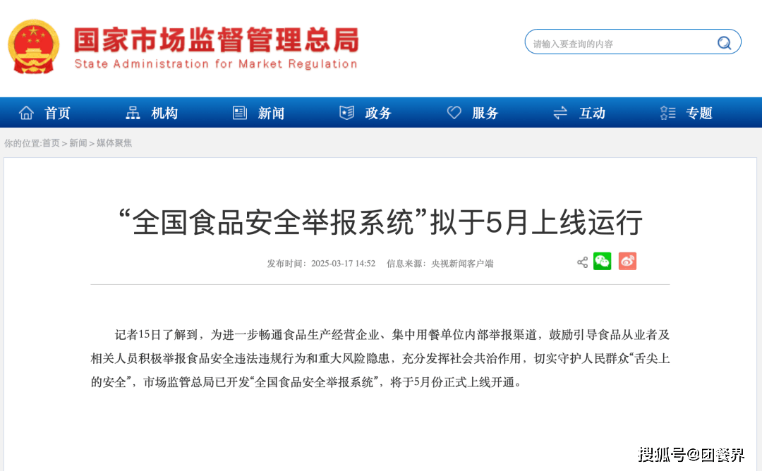 2025年3月,市场监管总局宣布“全国食品安全举报系统”于今年5月正式上线。这一系统通过内部举报优先、社会共治、技术等手段,将食品安全监管从政府单向治理升级为全民参与的科技化共治模式。